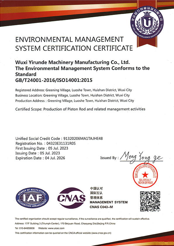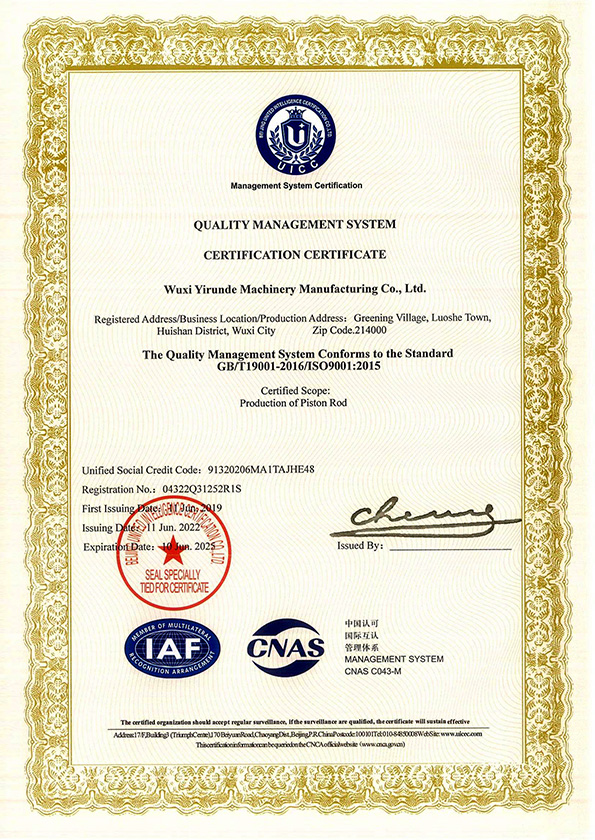 Wuxi Yirunde Machinery Manufacturing Co., Ltd. is an industrial enterprise specializing in the production of piston rods. The company has fixed assets of 5 million yuan and a factory area of 3000 square meters. The company currently has sawing machines, automatic straightening equipment, grinding machines, polishing equipment, CNC lathes, and other equipment. There are 4 production lines that can produce piston rods ranging from 20mm to 200mm in diameter. The enterprise has a series of production management systems, including 10 wire and 100 wire thickness gauges, desktop hardness testers, salt spray testers, surface roughness testers, etc., forming product production, processing, and quality assurance. The enterprise has won the market with its excellent quality, diverse varieties, short processing cycle, and moderate product prices, and has been favored and praised by a large number of customers.
